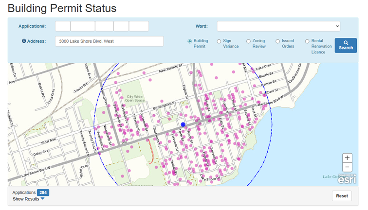 Type in the address or application number of the address in question. The pink dots are other addresses with building permits. The blue dot is your searched address.